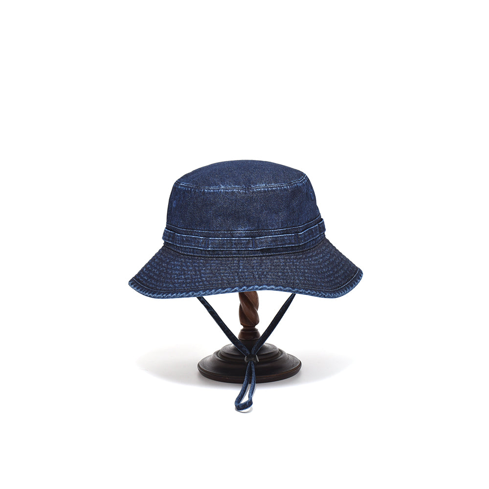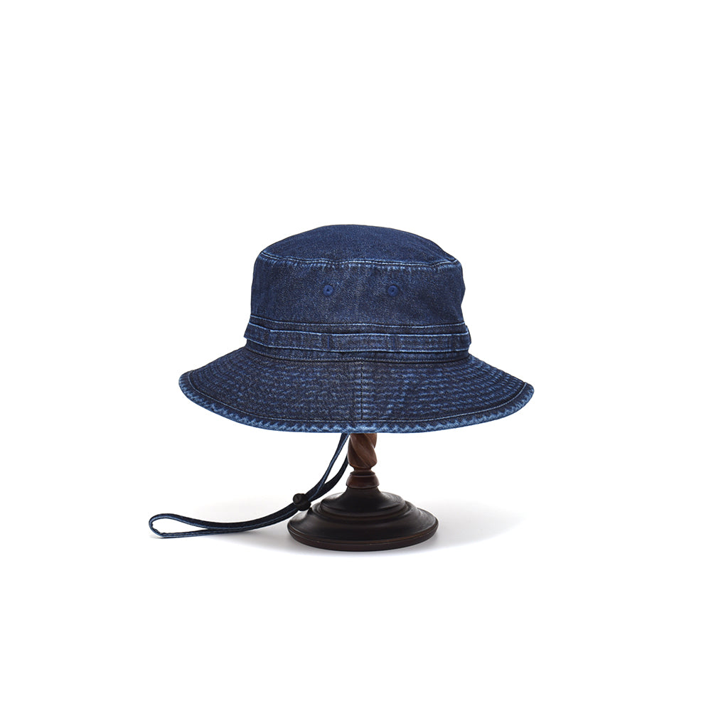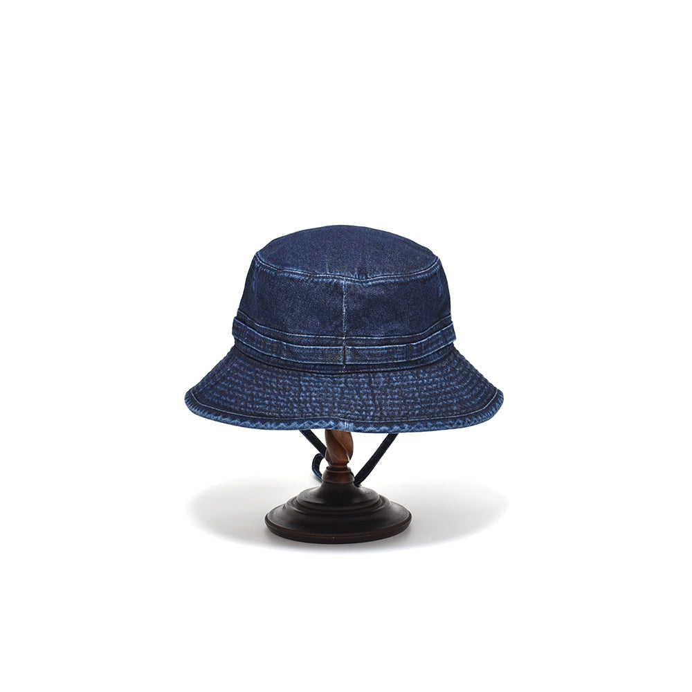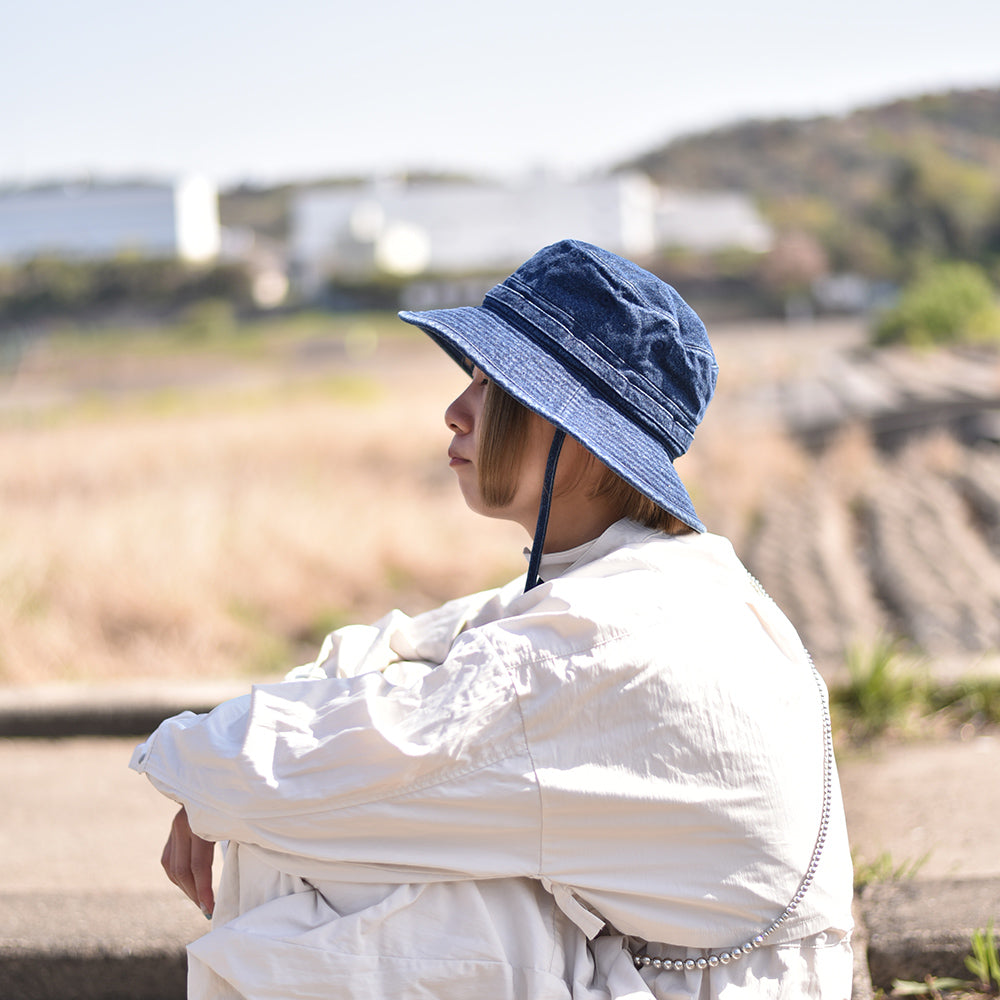 バイオウォッシュ加工した10oz インディゴデニムのオールシーズン使えるアゴ紐付きハット。