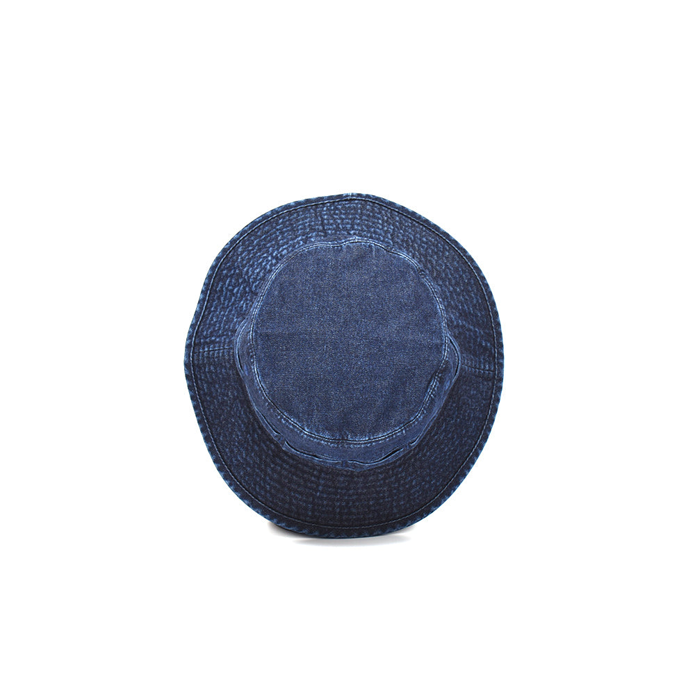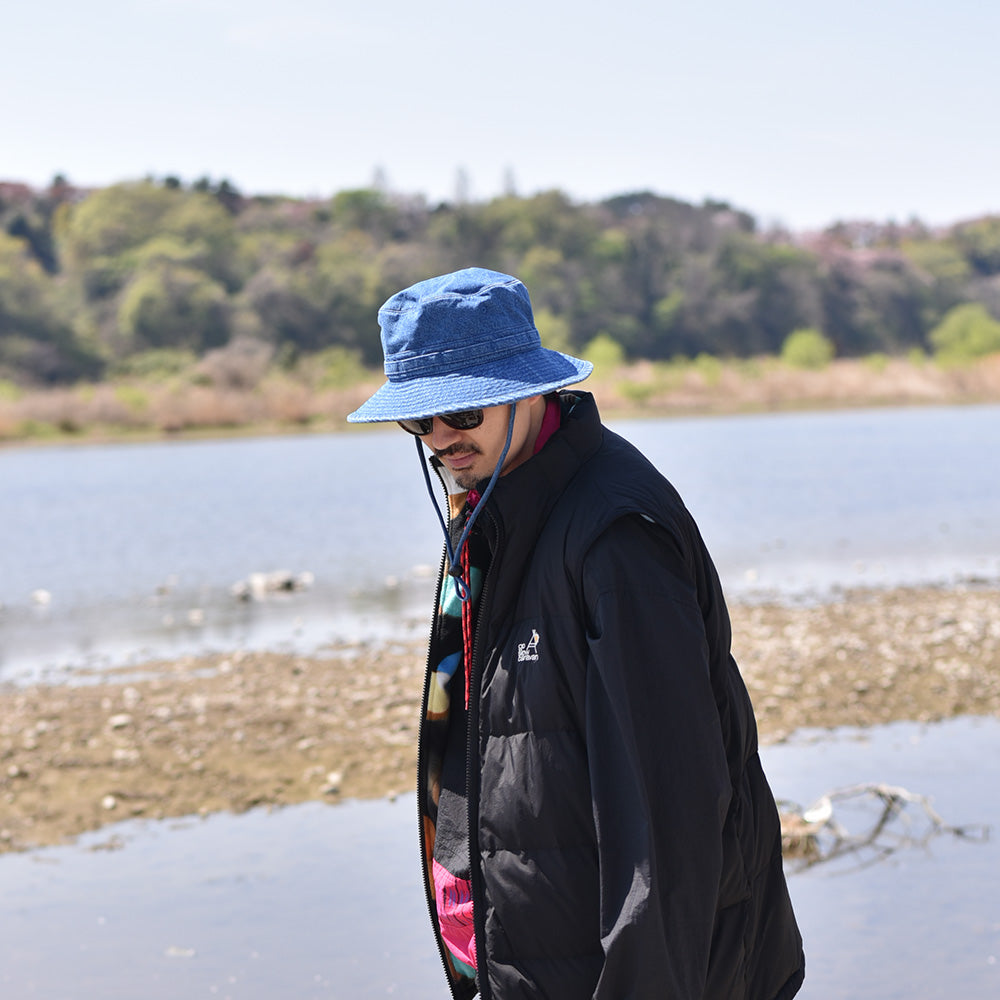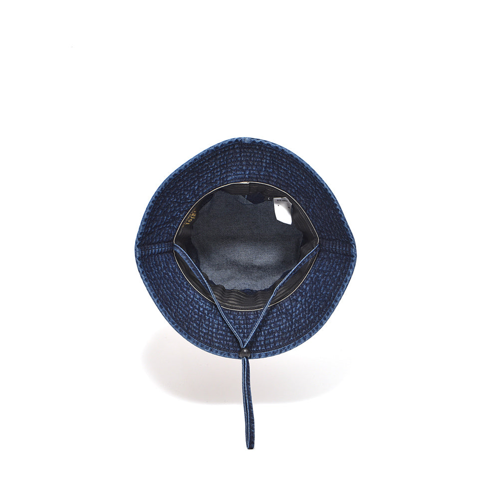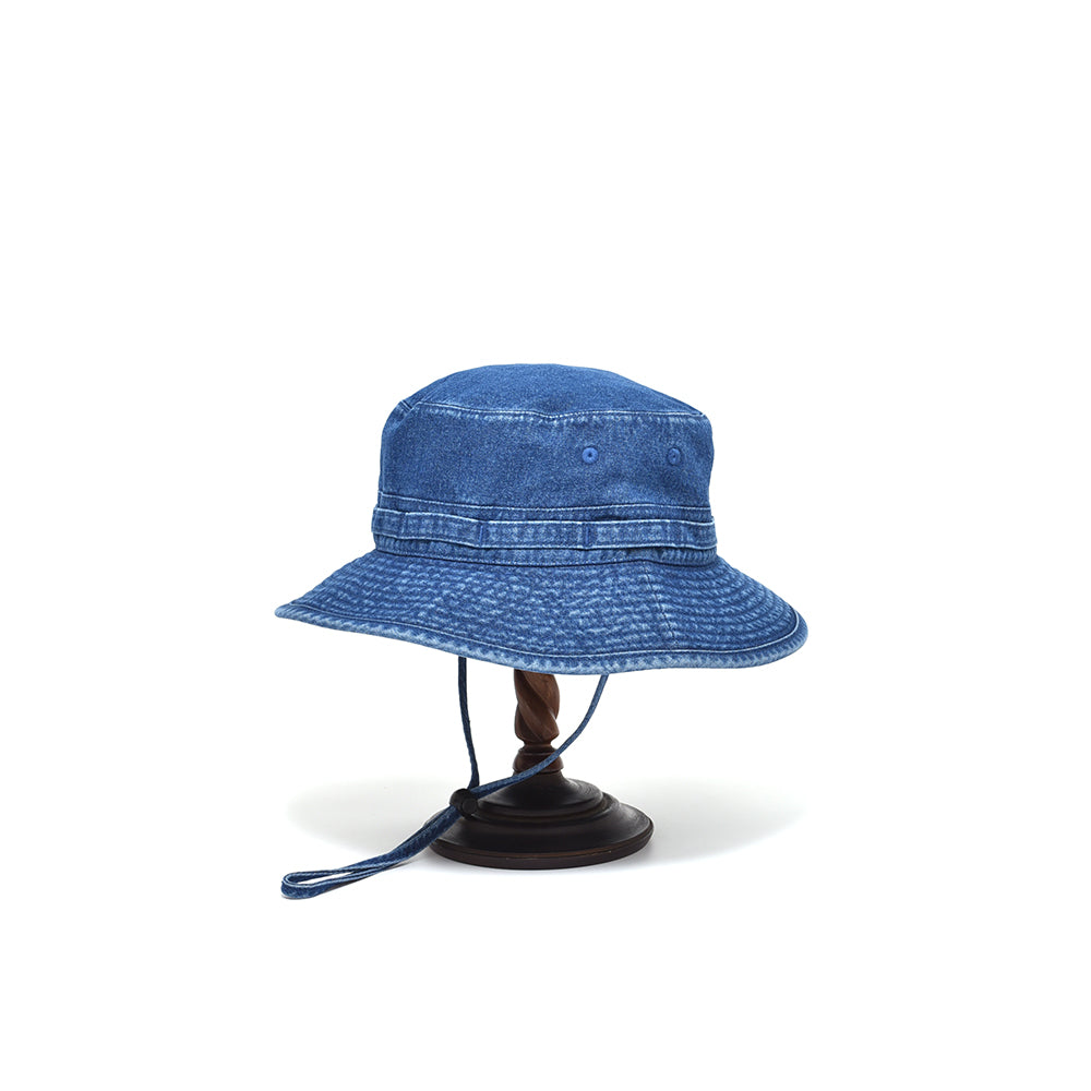バイオウォッシュ加工した10oz インディゴデニムのオールシーズン使えるアゴ紐付きハット。