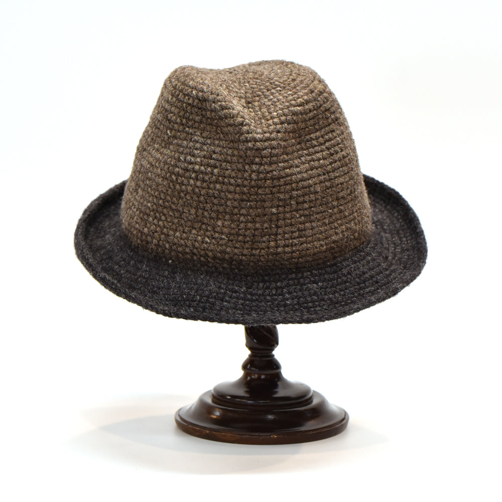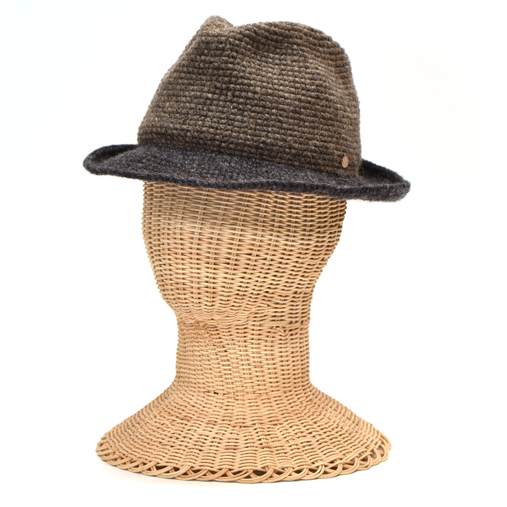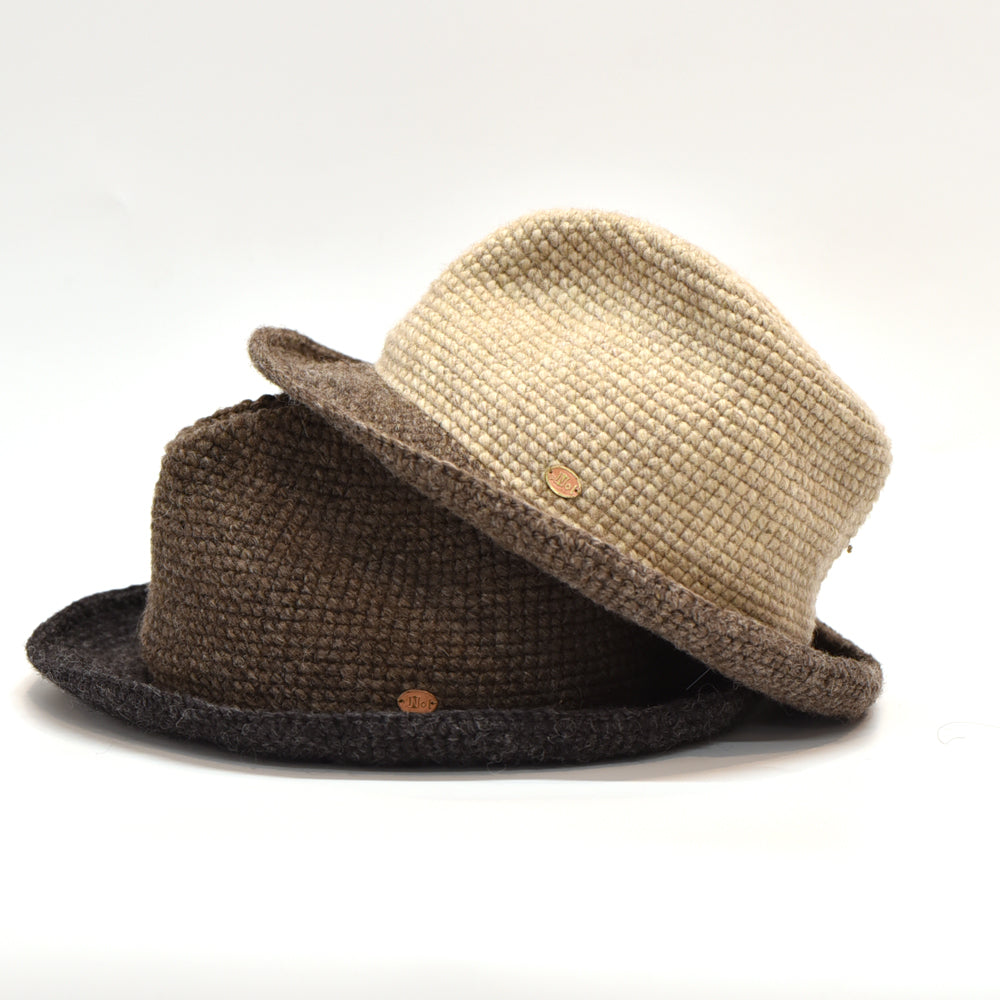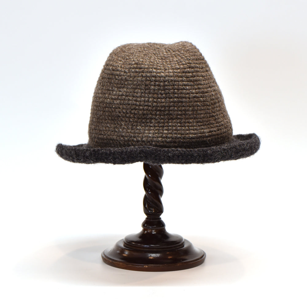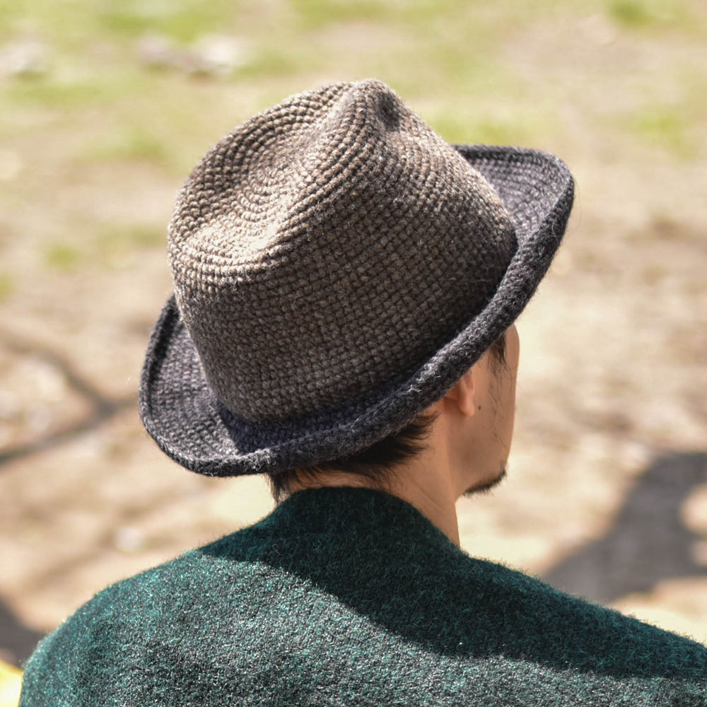 紡毛ウール糸の細編みハット。HAT に適した硬さをもつ手編みならではの表情があります。
