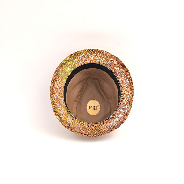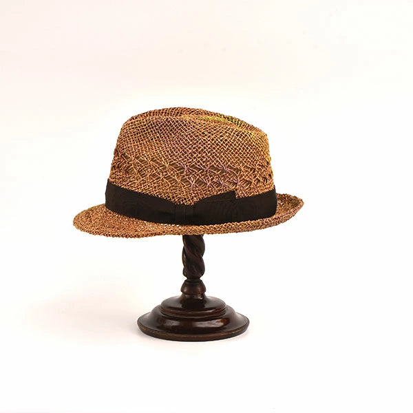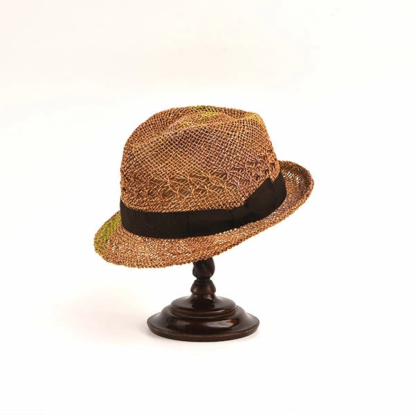 撚りパンダンを1 色ずつ染色し、手編みした5 色使いのスクリュー柄の先染め手編み中折れHAT