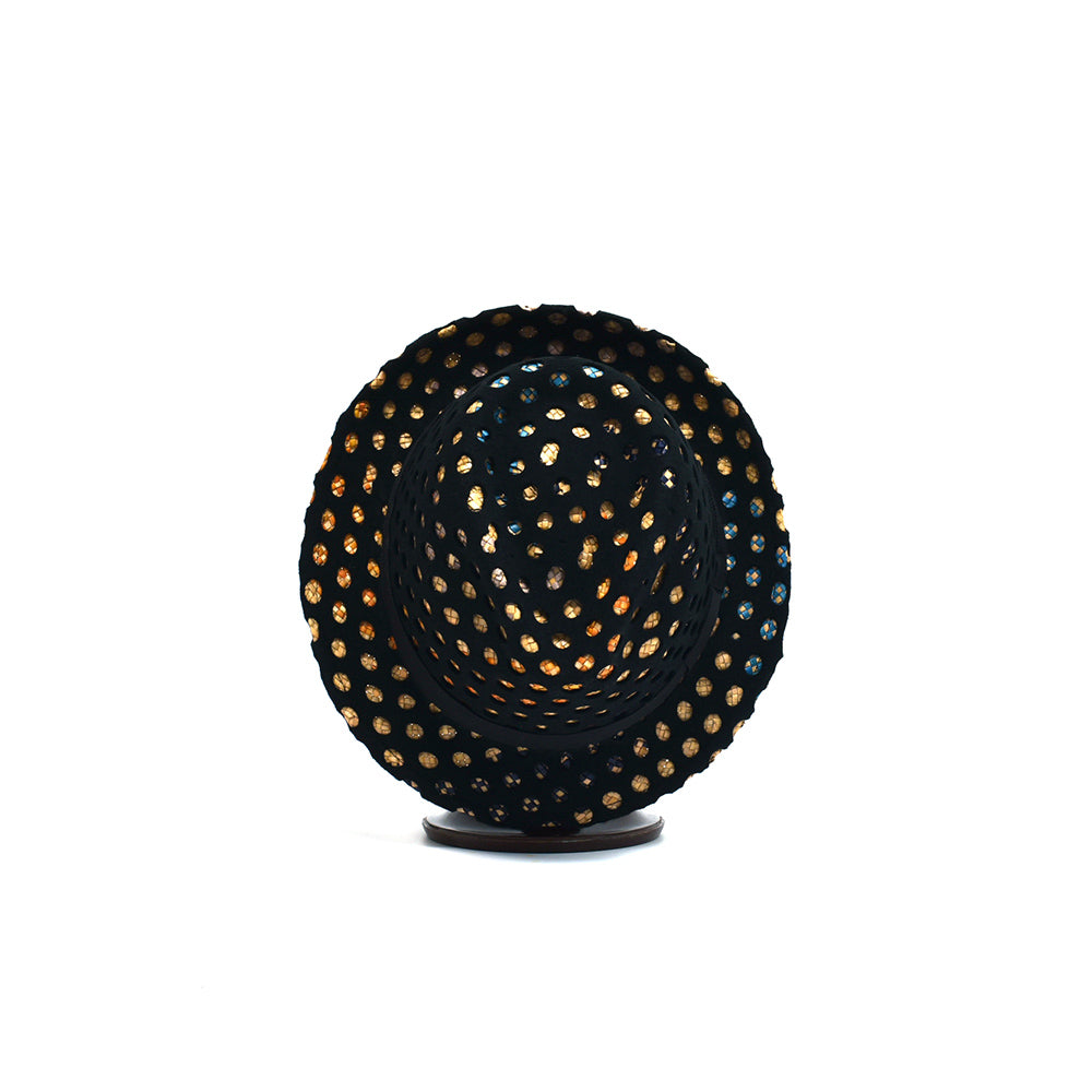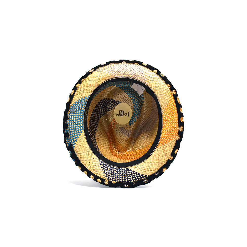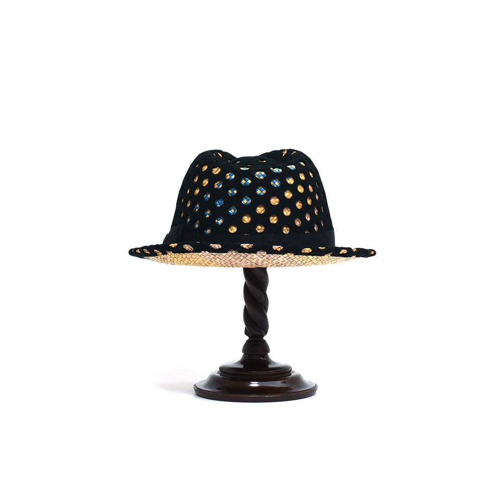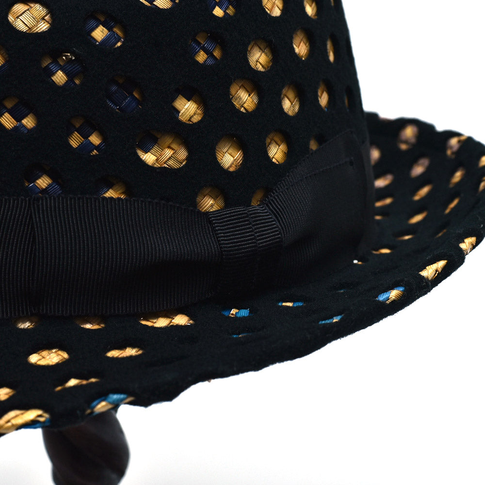 5 色に染めたパンダン草をオリジナル柄に手編みした先染め帽体の上へパンチング加工したフェルト帽体を重ねた他にはない中折れハット。