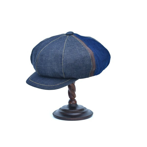 使い込むごとにインディゴ染料が色落ちして、きれいなフェードブルーに変化していき経年変化も楽しめる日本製のインディゴデニム(頭部分)、インディゴコーデュロイ(ブリム部分)、牛革(腰,ブリム先)を組み合わせた存在感抜群のキャスケット。