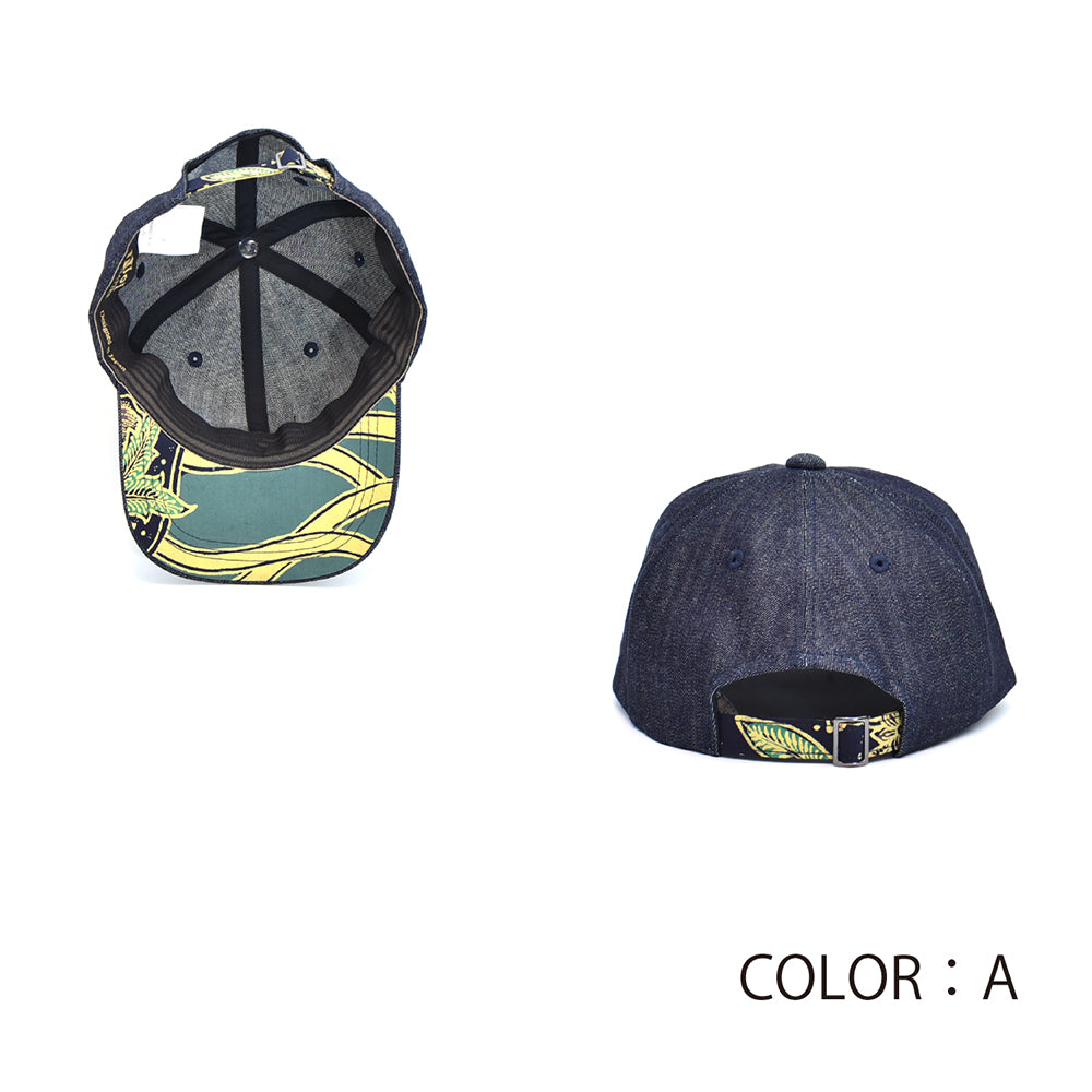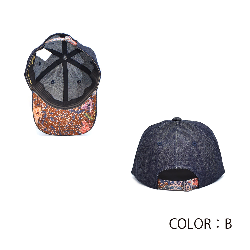 日本製10oz デニムベースにバイザー裏、ベルトをプカロンガン(ペカロンガン)産バティックと組み合わせた6パネルCAP。こちらのバティックは、華やかな色使いのプカロンガンらしい草花柄を使用しました。